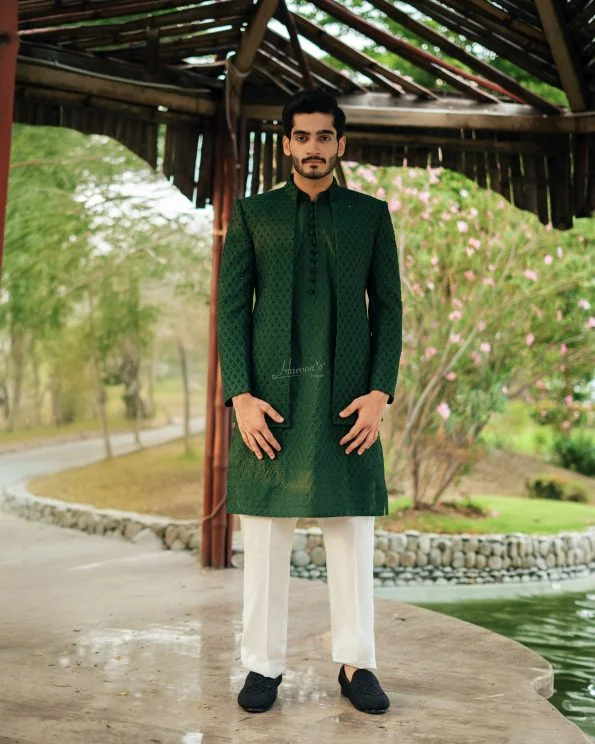 This green open-style Prince Coat is designed with high-end premium stitching. The front is adorned with intricate hand-embellished artwork, making it the perfect choice for formal occasions. Featuring the HD signature round ban collar and a sleek, straight-bottom finish.