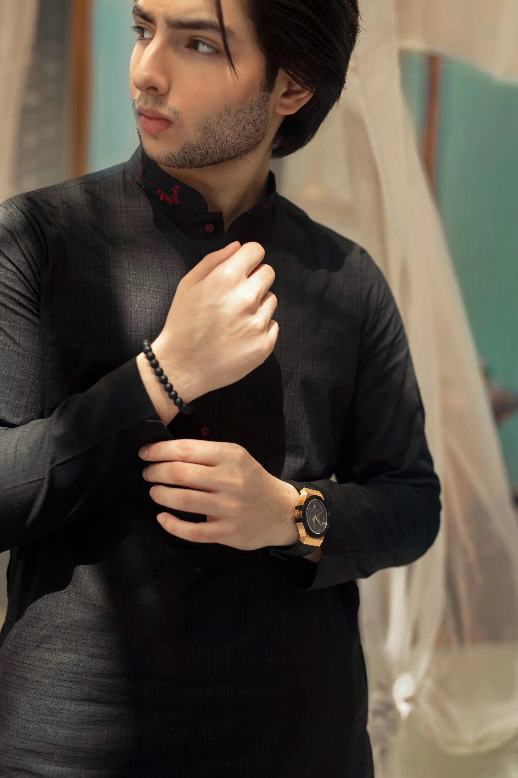 Made from the finest black raw silk, this Kurta Trouser combines exquisite stitching with a soft, luxurious texture.